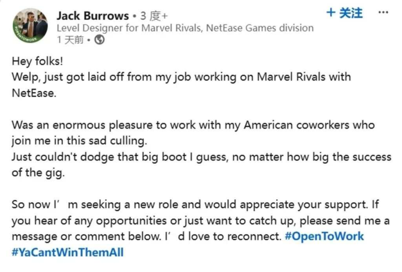 2月下旬,《漫威争锋》美国团队遭遇了大规模裁员,关卡设计师杰克・伯罗斯(Jack Burrows)在领英上表示“刚刚被裁员”,消息一出便震惊了整个行业,还有大量玩家因此在 Steam 上打差评。