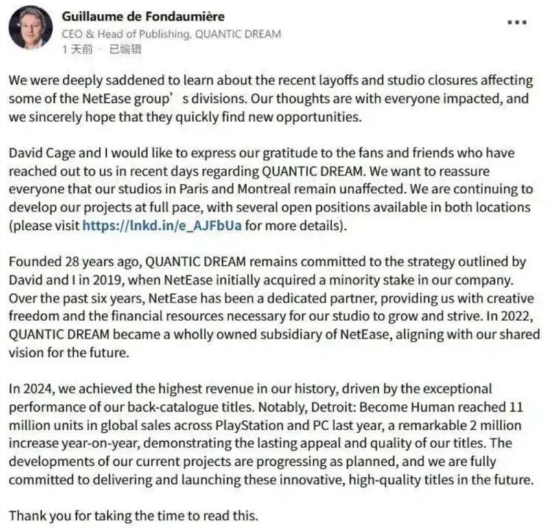 众多裁员消息扑面而来,不少游戏行业人员发出网易旗下工作室是否岌岌可危的担忧,日前,曝网易CEO丁磊决定撤回海外地区部分工作室的投资后,《底特律:变人》开发商量子梦CEO Guillaume de Fondaumière在领英发文,向粉丝们确认当前工作室的状态,并表示一切正常,不受影响。