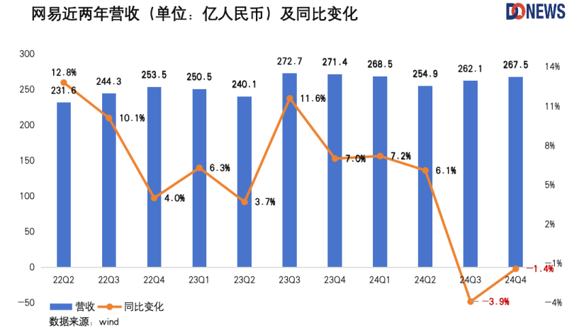 过去两个季度,网易的营收一直在下滑。在过去两年半的大部分时间里,网易的营收增长一直维持在个位数水平。去年全年,网易实现总营收1053亿元,同比仅微增1.7%。