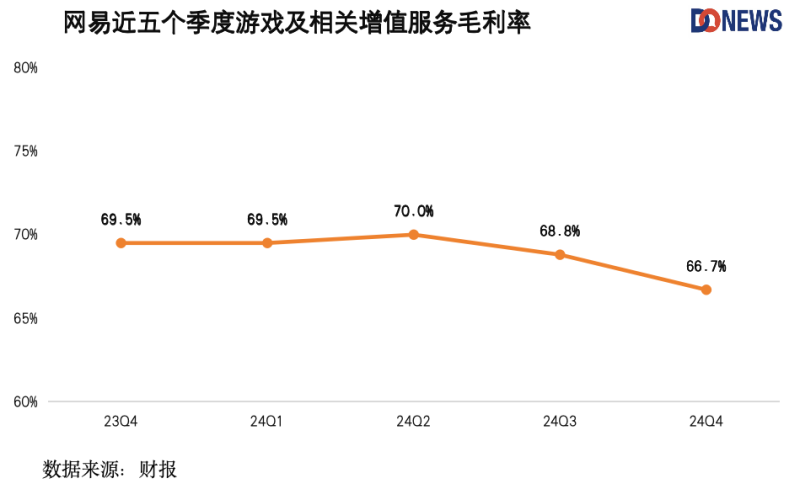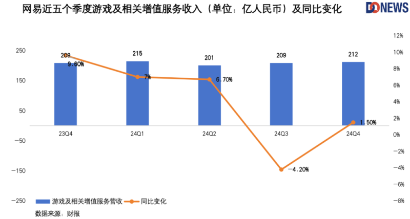 然而,网易游戏收入增长乏力,尤其是手游表现疲软。若非暴雪回归带动端游收入增长,去年游戏收入可能更不乐观。财报显示,2024年手游净收入占在线游戏净收入的72.7%,低于2023年的75.2%,收入主要得益于《永劫无间》和代理暴雪游戏(如《魔兽世界》《炉石传说》)的端游收入增长。展望2025年,网易手游收入增长仍面临压力。